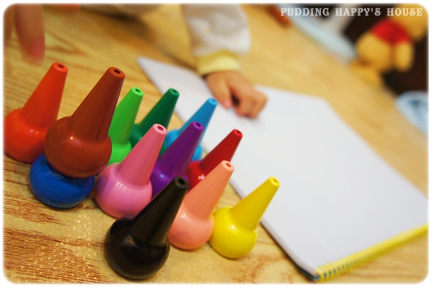 布丁手上就多了這組老母愛心來著的無毒蠟筆外加一本海綿寶寶的畫冊讓他姿意發揮